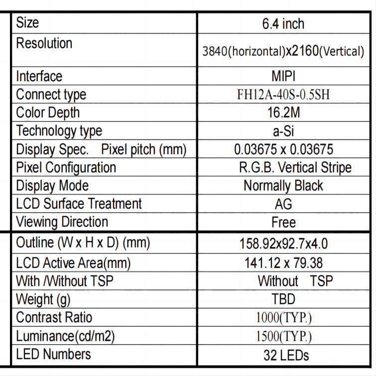 ESHX064UHD to 6,4-calowy wyświetlacz TFT LCD o wysokiej rozdzielczości, rozdzielczości 3840*2160 i interfejsie MIPI, kąt widzenia to cały widok, jasność 1500 c/d